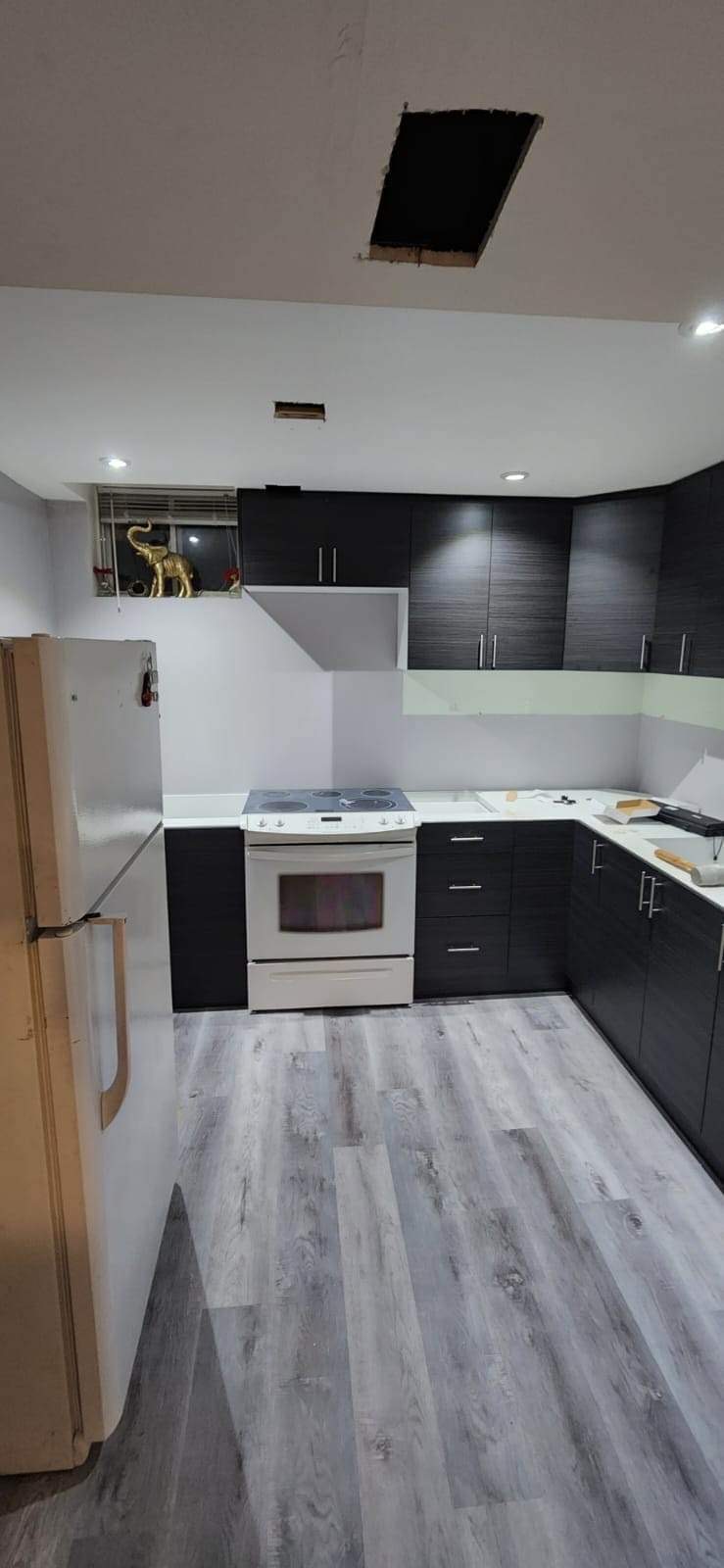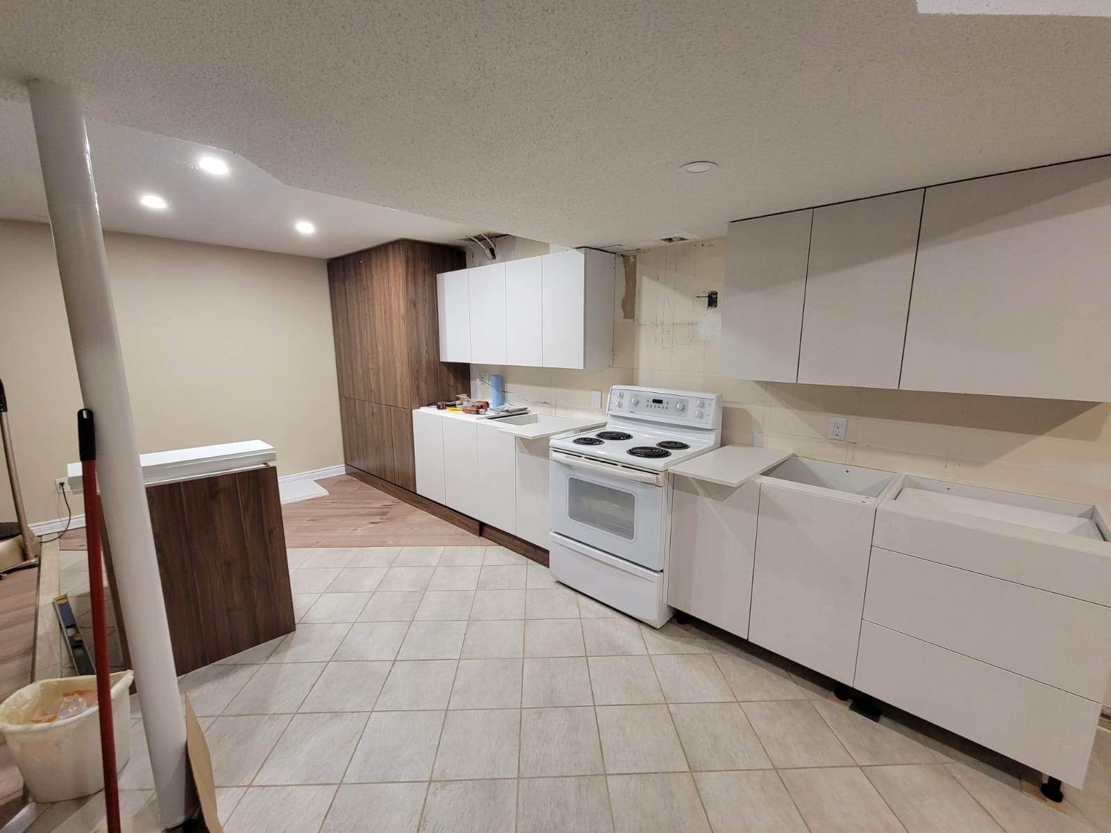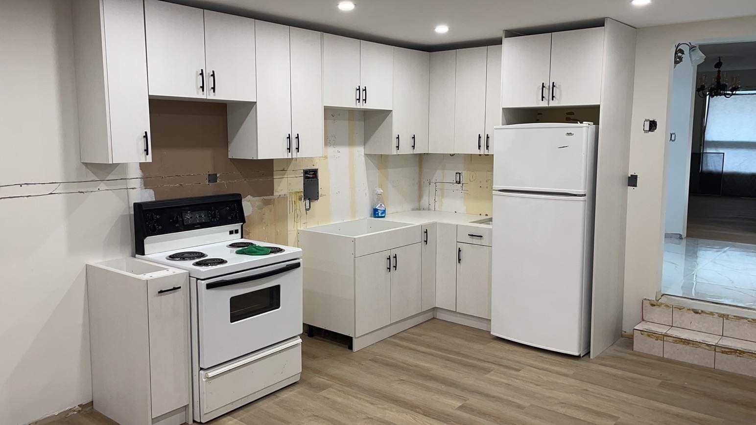 - Remove existing cabinets, appliances, flooring, and fixtures.
